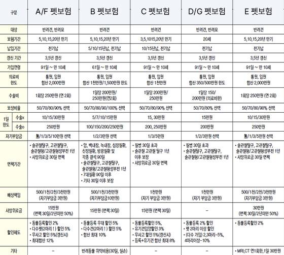 펫보험이라고 해서 모두가 똑같은 보장과 보험금을 준다고 생각하시는 건 금물! 각 보험사 펫보험 상품별 많은 차이가 존재하기 때문에 보장 한도와 범위, 장&단점을 비교한 후 가입을 고려하는 것이 좋아요. 그럼 우리 아이들이 가입할 수 있는 상품에는 어떤 종류가 있는지 알아볼까요?