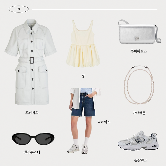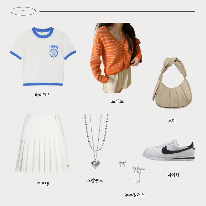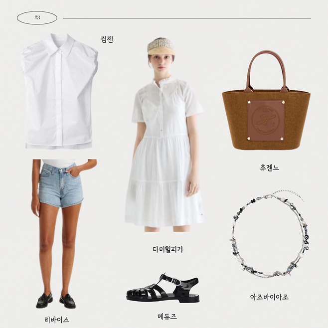 한 눈에 보기에도 시원해보이는 화이트 컬러를 강조해더욱 청량해보이는 룩이야!!마땅한 화이트 컬러가 없다면 실버 아이템을 매치해줘도 좋을 것 같아~~