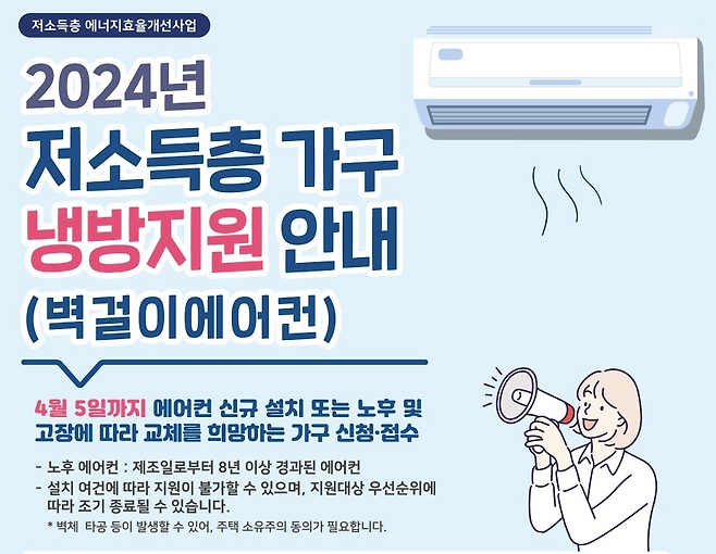 한여름의 폭염이 일상화되면서 해마다 여름나기가 저소득층에게는 어려운 일이 되었습니다. 이러한 저소득층의 냉방복지 제고를 위해 고효율 인버터 벽걸이 에어컨을 설치하는 냉방 지원을 하는 사업이 시행됩니다. 2024년에는 예년보다 훨씬 빠른 시점인 2월 26일부터 신청접수를 시작합니다. 예산 소진시까지만 진행되는 사업이니 대상이 되는지 지자체에 문의하여 확인하시기 바랍니다.