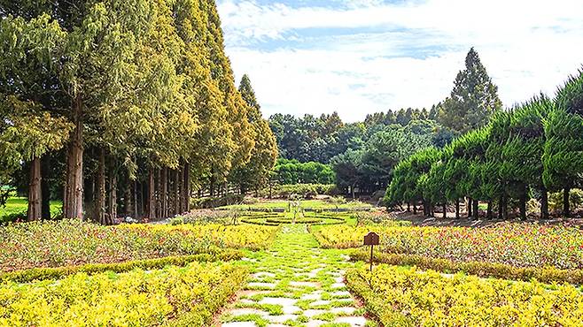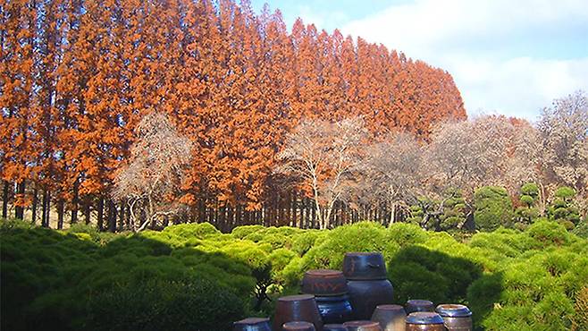 아가페정원의 상징은 단연 40m 높이의 메타세쿼이아 터널입니다. 10월이 깊어지면 잎사귀들이 일제히 황금빛으로 물들며, 산책길 전체를 황금빛 융단으로 덮어버립니다.