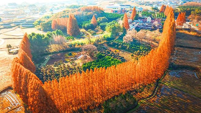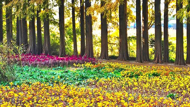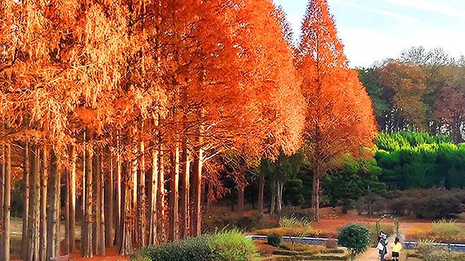 전북 익산의 숨은 보석, 아가페정원입니다. 메타세쿼이아의 황금빛 터널과 공작단풍의 진홍빛, 은행나무의 노란빛이 하나의 팔레트를 이루며, 마치 잘 짜인 교향곡 같은 가을 파노라마를 완성합니다.