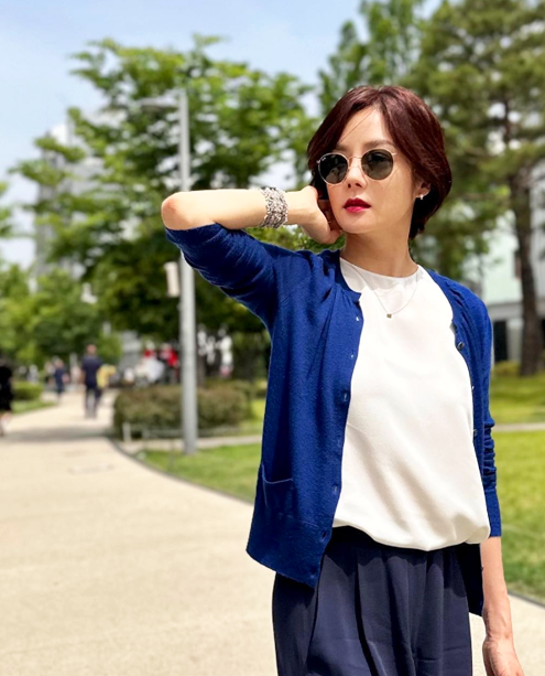 채림은 깔끔한 화이트 라운드넥 톱에 네이비 컬러의 가디건과 슬랙스를 매치해 클래식한 분위기를 연출했다.