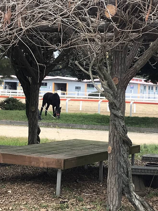 그런데 신기하게도 그 말과의 이별은 이게 완전한 끝이 아니었다. 나 또한 또한 차례의 전보 인사가 갑작스럽게 생겨서 그 말이 복귀하는 경마장 안으로 근무지가 옮겨진 것이다. 이내 운동 복귀를 앞둔 그 말을 마침내 조우하게 되었다. 다른 공간에서 다른 역할로 다시 만나게 되는 게 사람이 아니고 동물이라는 게 조금 묘했다.