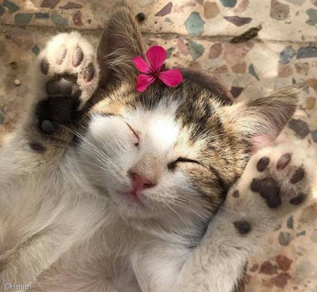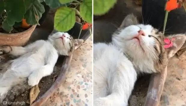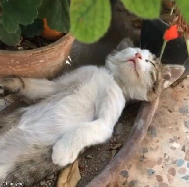 아기 고양이는 할머니의 화분을 침대 삼아 뒤로 발라당 누운 채 몸을 쭉 뻗고 잠을 자고 있었다.