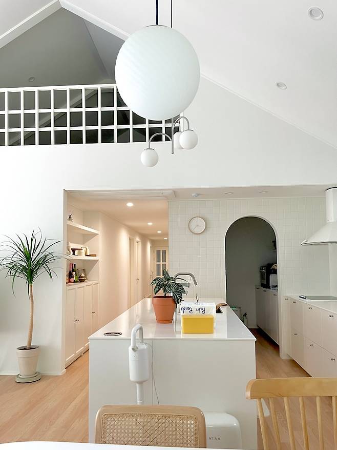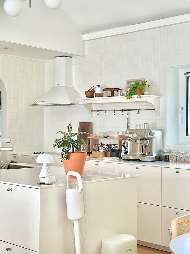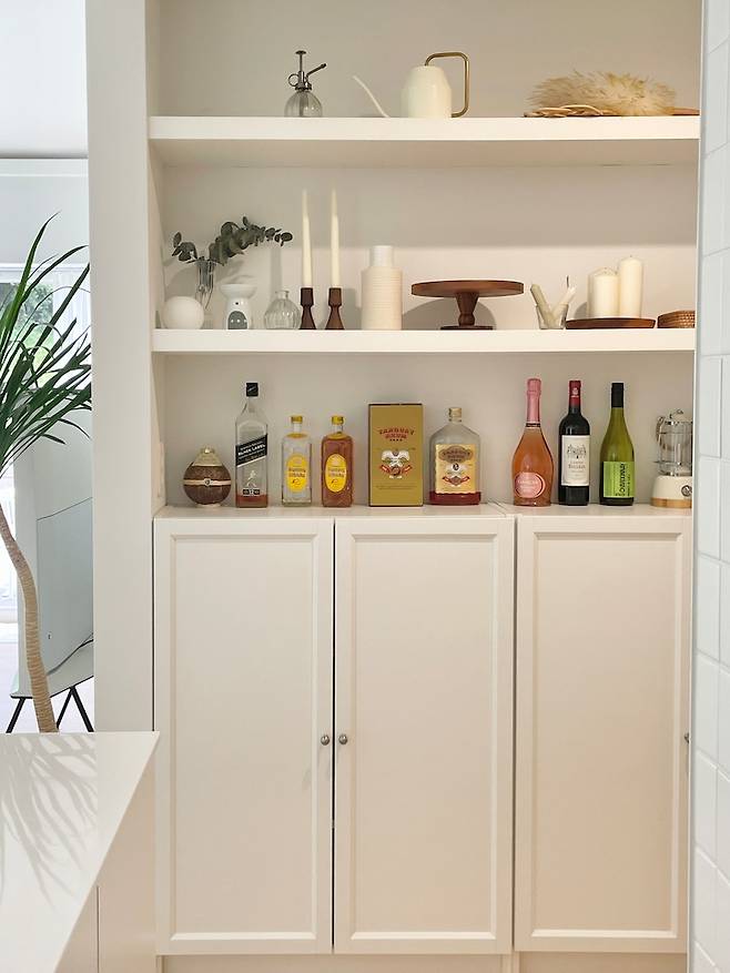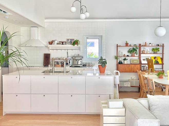 주방의 상부장은 손도 안 닿아 불편했고 물건 쌓아 놓는 용도로 밖에 못쓰던 과거의 제 모습을 보고 상부장을 없앴어요. 상부장 없이 계획하다 보니 싱크대의 크기가 좀 커져서, 올 화이트로 답답한 느낌을 없애야겠다 싶었죠.