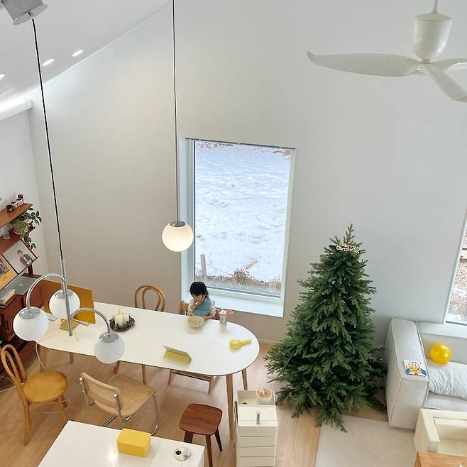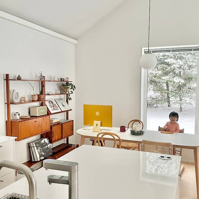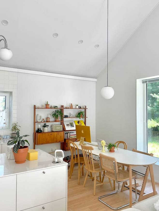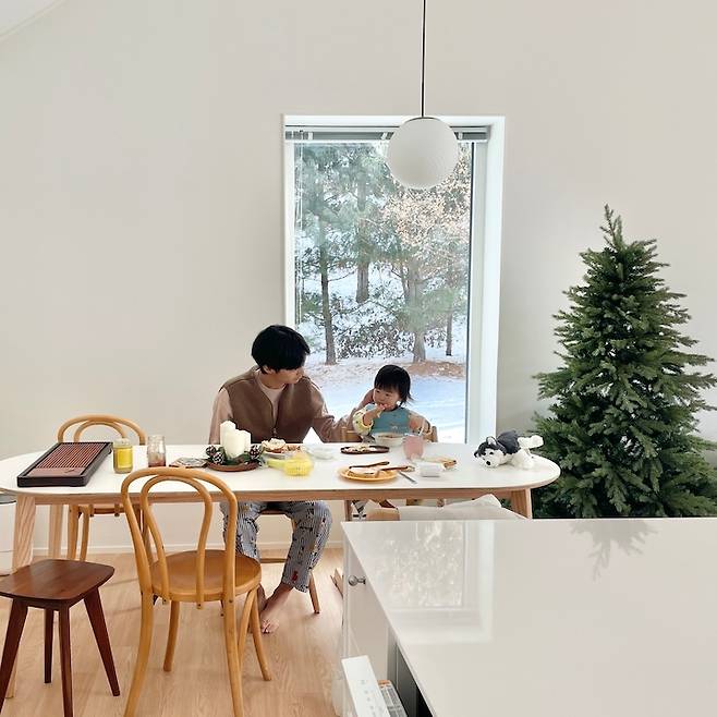 큰 나무가 보이는 숲 쪽으로 픽스 창을 두 개 내어 한 곳에는 식탁을 두었어요. 가족이 다 같이 모여 식사하는 시간이 소중해서 가장 좋아하는 풍경이 있는 곳으로 식탁 위치를 정했어요.