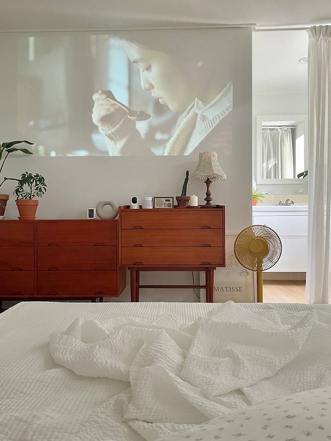 집 구조의 변경을 좋아해서 붙박이장도 하지 않았기 때문에 벽걸이 티비 또한 원치 않았어요. 셰리프 티비는 블랙 앤 화이트의 깔끔한 디자인도 마음에 들고 이리저리 옮길 수 있어서 고민 없이 골랐네요. 뒤에 선 정리가 조금 어렵긴 하지만 만족스러워요.