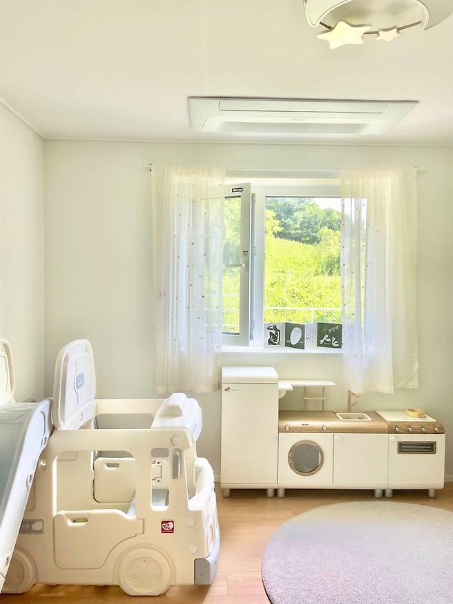 아이가 아직 어리기도하고, 잠은 안방에서 그림 그리기나 독서등 여러 활동들은 거실에서 주로 하고 있다 보니 아직 꾸며주지 못했어요. 아이방도 곧 인테리어를 할 생각이라 열심히 찾아보고 있는중이고 조금 설레기도합니다. 우선은 이곳을 놀이방으로 만들어 둔 상태에요. 소꿉놀이 싱크대와 책장 미끄럼틀 버스, 트램폴린을 뺑 둘러 배치했어요.