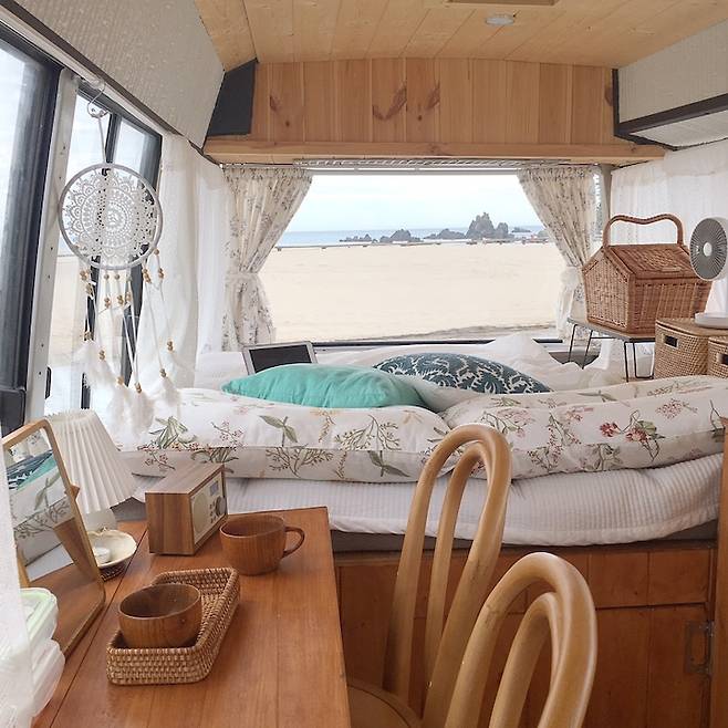 집을 짓기 전 신혼시절 여행과 캠핑을 즐겨하던 저희 부부의 첫 로망은 캠핑카를 만드는 것이었어요. 바로 실행에 옮겨 아버지와 최소한의 작업으로 버스 캠핑카를 만들었죠.