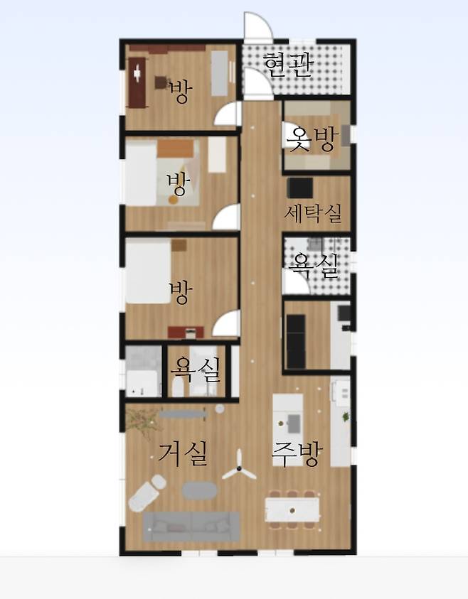 이 도면은 오늘의집 3D프로그램으로 만들어 놓았던 건데, 사용하기 쉬워서 집 짓는 과정에서 많은 도움을 받았어요. 집을 지을 때 모토는 심플하게! 였어요. 아버지께서 건축을 하시다 보니, 집이라는 건 비가 새지 않고 따뜻해야 한다는 본질이 중요하다고 강조하셨거든요. 저희도 그 말에 동의했고, 멋 부리기 보다는 따뜻하고 걱정 없는 집을 짓자 생각했어요.