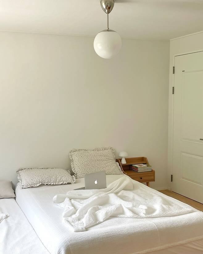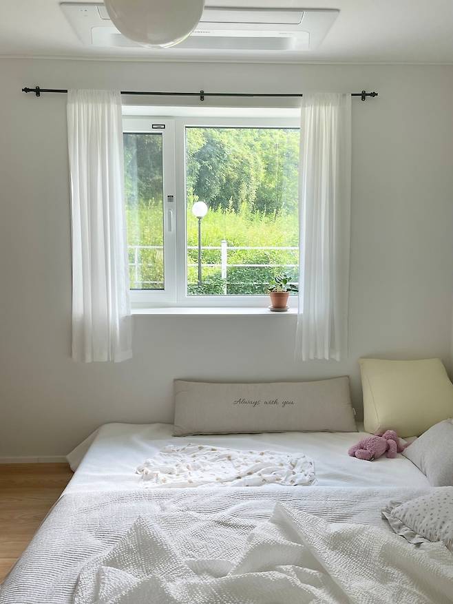 침구와 커튼은 화이트컬러를 선호해서 커튼봉은 블랙으로 포인트 줬어요.