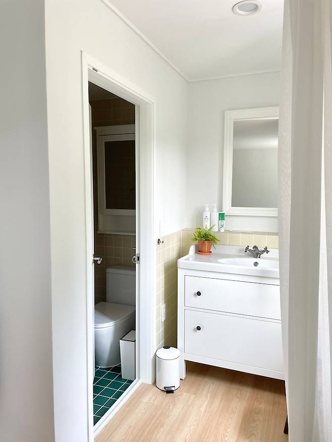 세면대 왼편으로는 작은 공간에 변기와 욕조만 자리하고 있어요. 바닥은 녹색 타일로 포인트를 주었고요.