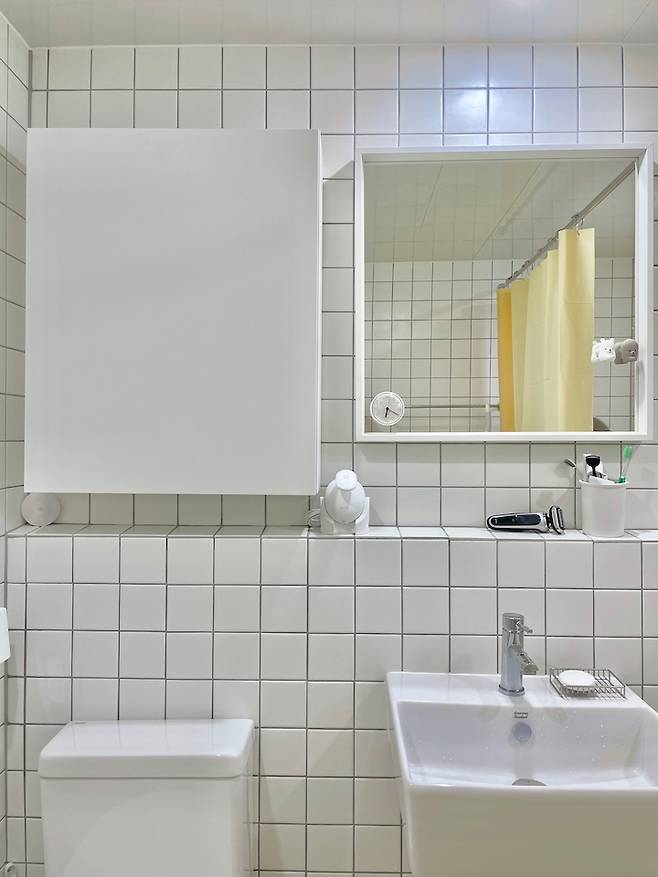 세면대의 높이도 고민하다가 조금 높여서 시공해봤는데 크게 체감되는 부분은 없어요. 그리고 욕실거울과 수납장도 모두 이케아로 했는데 깔끔해서 만족하고 있어요.