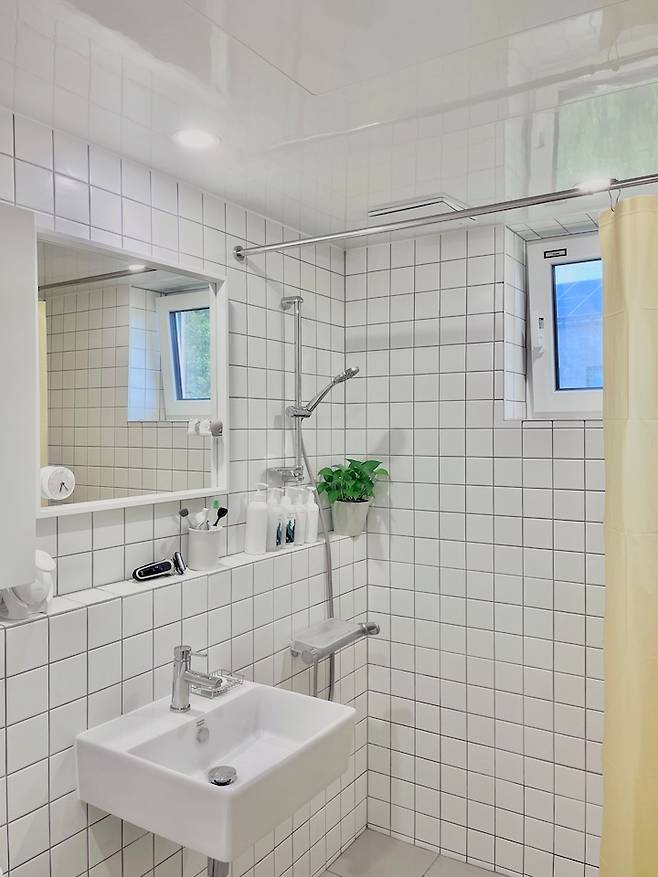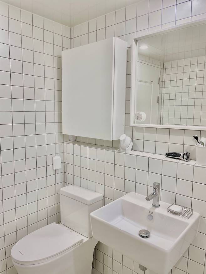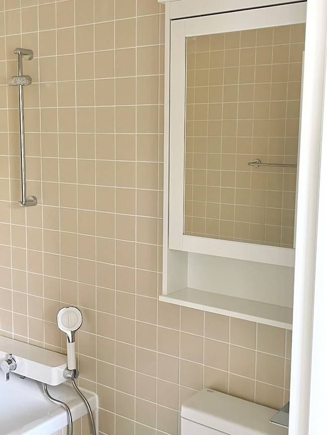 보조 주방에 썼던 베이지 타일을 썼는데, 화이트와 잘 어울려요. 거실 욕실에는 욕조를 빼고 이곳에 넣었어요.