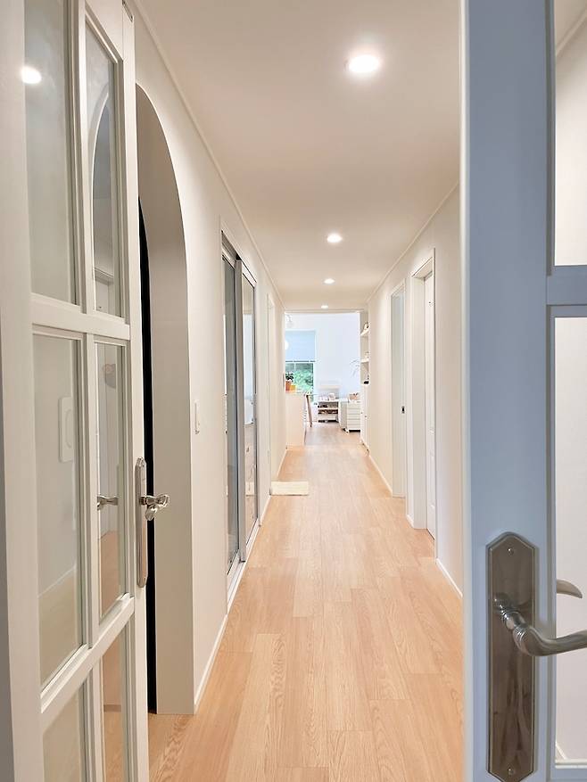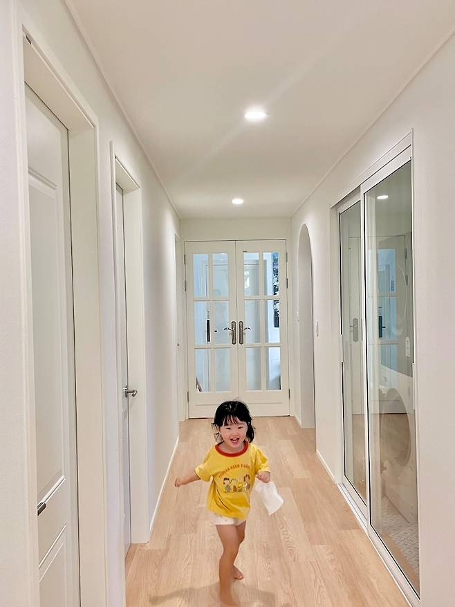 이렇게 긴 복도가 공간의 활용성 면에선 좀 아깝다는 생각이 들었지만, 아이랑 놀기엔 너무 좋은 공간이라 만족하고 있어요. 복도를 신나게 뛰어다니고 씽씽을 타기도 하는 아이의 모습을 볼때 주택으로 오길 잘했다 싶어요.