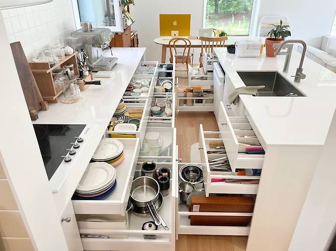 주방 수납은 모두 다 서랍으로 구성했고 모두 속 서랍을 넣어서 더 효율적으로 사용하고 있어요. 이케아 서랍 시스템이 쓰다 보니 물건 정리도 쉽고 찾기도 쉬워서 편리해요. 맨 아랫 부분 서랍은 다 열지 않았는데도 물건이 많이 들어갔죠. 속 서랍은 추후에 셀프로 뗄 수도 있고 추가할 수도 있어서 이케아 주방 시스템의 꽤나 큰 장점이라고 생각해요.