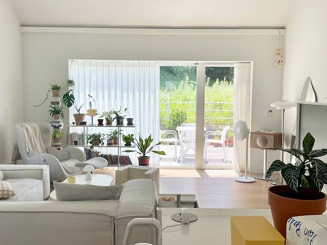 거실 한 켠으로는 마당을 볼 수 있는 창과 출입문이 있어요.