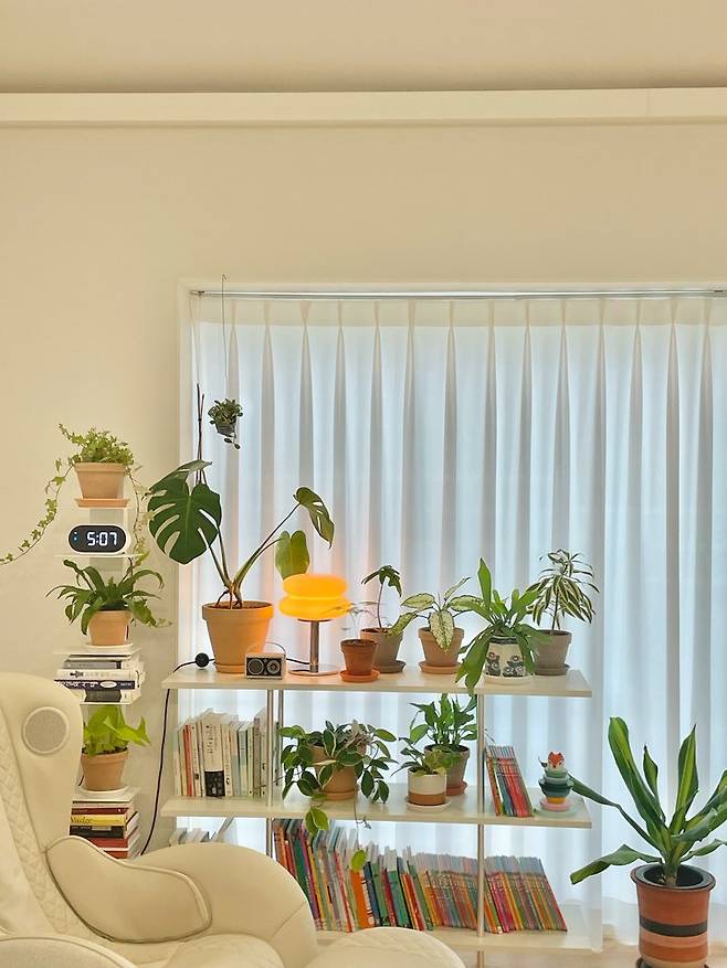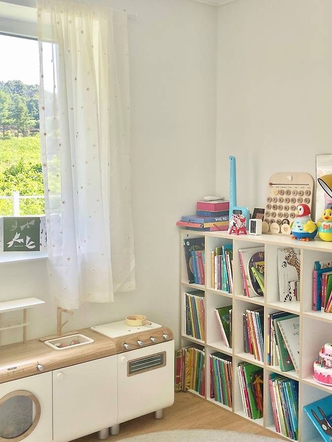 지금은 이렇게 배치를 바꿨고, 창가에 물건이 좀 더 많아졌네요. 제가 식물 키우기를 좋아해서 자주 보는 곳에 두고 싶었어요. 아이 책과 함께 선반장에 정리해두고 아이와 함께 물 주기 놀이를 하기에도 좋아요.