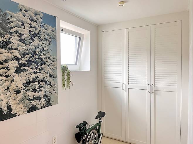 현관문을 열고 들어와 왼편으로 신발장을 위치시키고, 공간을 조금 넓게 만들었어요. 주택은 자전거나 유모차 택배 등을 놓을 공간이 꼭 필요하더라고요.