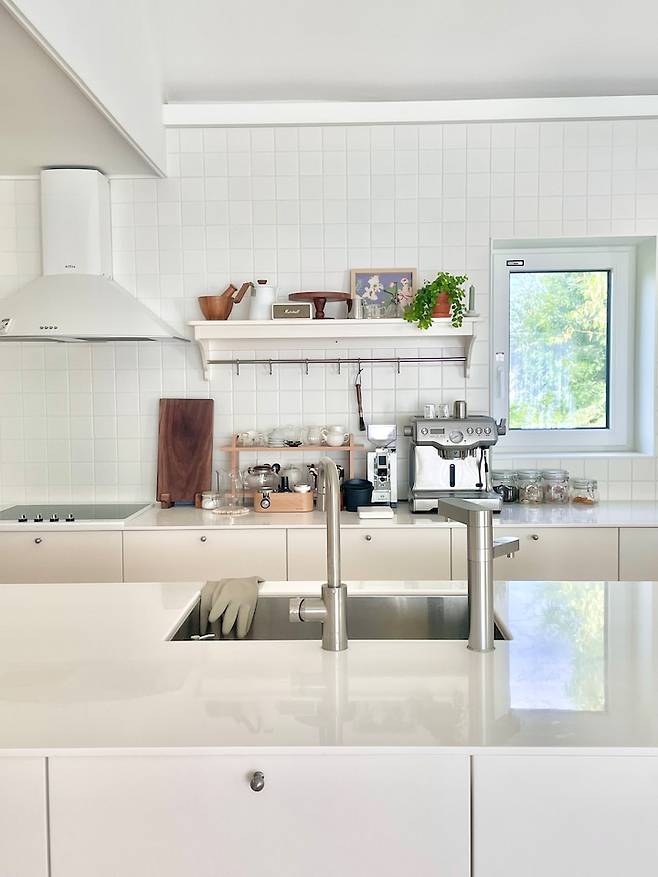 싱크대는 이케아 메토드 시스템으로 만들었고, 베딩에로 서랍을 깔끔하게 , 상판은 lx 하이막스 캔디 화이트, 인덕션은 스메그, 후드는 하츠로 했는데 제가 원했던 올화이트 주방의 구색이 잘 갖춰진 것 같아요.