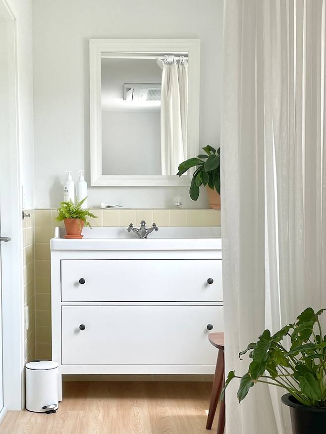 수납장 옆으로는 건식 세면대가 자리하고 있어서 린넨 커튼으로 공간 분리를 했더니 조금 더 아늑해졌어요.
