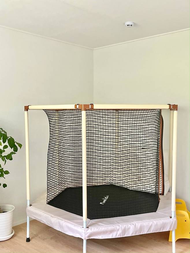 트램폴린은 가장 큰 사이즈가 오래 사용할것 같아 설치해두었는데 정말 커요. 집의 공간에 맞게 사이즈 선택을 신중히 해야할 것 같아요. 출입문 쪽으로는 아이가 올라가기 편하도록 이케아 스탭스툴을 뒀어요.