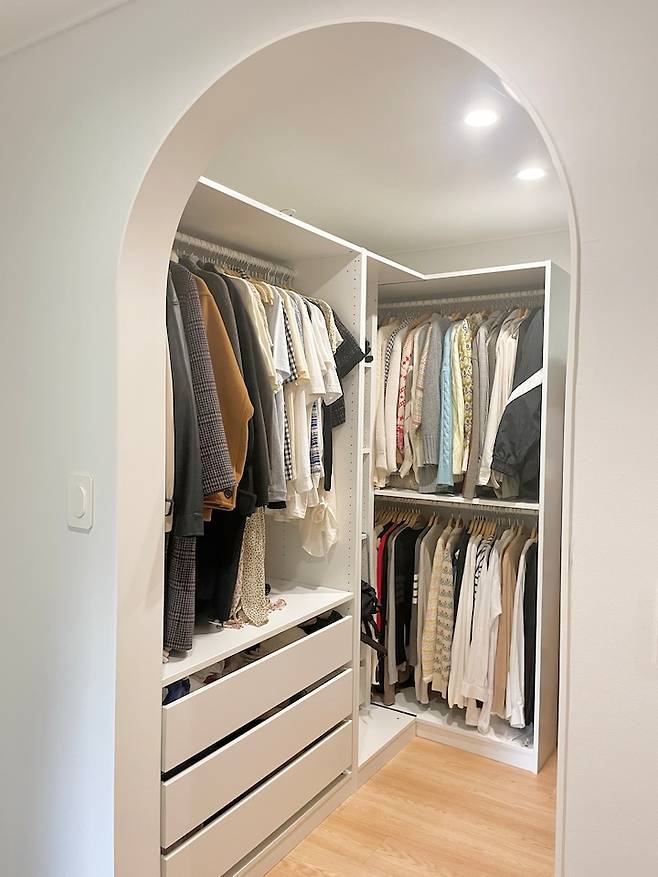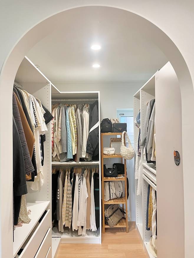 정리가 덜되어서 공개해도 될지 고민했던.. 드레스룸이에요. 이곳은 아치형 문틀만 만들고 드나들기 편하게 문을 만들지 않았어요. 정리를 해도 약간 너저분해 보이는게 옷방이라, 가볍게 커튼으로 가려줄 계획이에요.