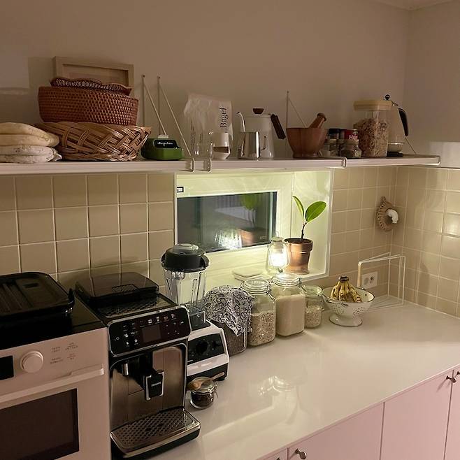 자질구레한 물건이나 설거지, 행주 등을 말릴 때 보조 주방을 이용해 하니 싱크대 위 정리가 쉬워졌어요. 약간 소음이 있는 오븐 겸 레인지, 자동 커피머신, 믹서기도 여기에 위치해있고요.