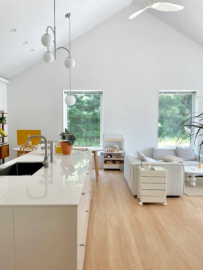 주로 거실에서 생활하는 라이프 스타일에 맞게 가장 좋아하는 숲 뷰는 거실과 주방에 배치하고 싶었거든요. 거기에 방은 모두 남향으로 배치하다 보니 긴 복도의 단순한 직사각형 집이에요. 저희가 전문가가 아니다 보니, 멋진 집은 아닐 수 있겠지만 라이프 스타일과 취향은 충분히 고려할 수 있었어요.