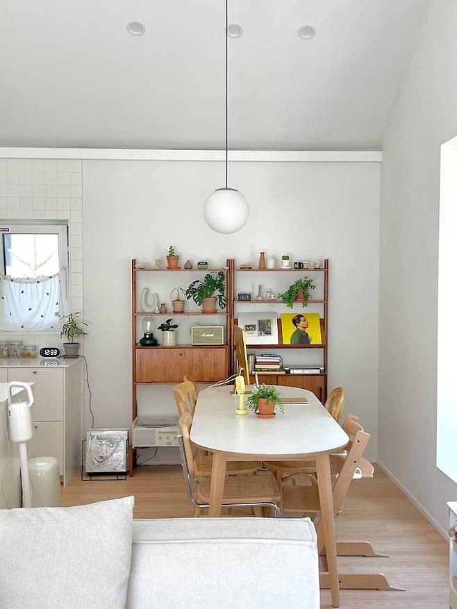 식사와 차 타임은 물론이고 아이 놀이와 독서, 업무도 하기 위해 큰 테이블을 뒀어요. 다이닝 공간에 큰 테이블을 두다보니 싱크대와 마찬가지로 자리차지를 크게 하더라고요.