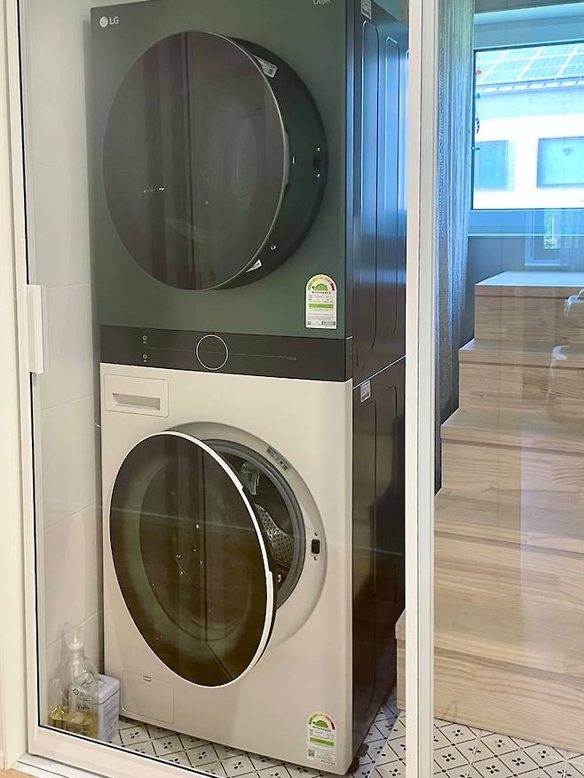 세탁기는 복도 한 켠에 위치해있고 중문을 설치해 공간을 나눠 소음이나 열기를 좀 차단했어요. 이 투도어 중문은 많이 하는 중문이 아니라서 찾아보다가 발견한 영림 제품이에요. 한쪽으로 활짝 열리는 미닫이로 제한적인 공간에서 쓰기 좋아요. 조금 힘들게 열리기때문에 아이가 쉽게 열 수 없어 혹시 모를 계단 사고도 예방 할 수 있어서 잘했다싶어요. 바닥과 벽면 모두 타일로 마무리했고 바닥은 단차를 주어 낮춰 혹시모를 물샘에도 걱정 없도록 했어요.