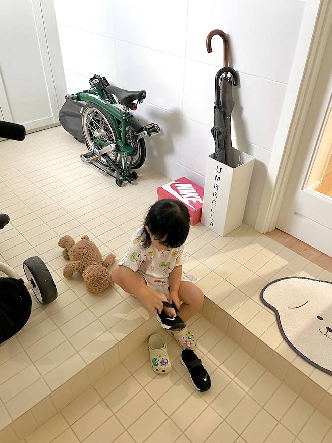 현관은 모두 타일로 마감했는데 벽은 깔끔하게 화이트를 골랐고, 바닥은 버터색으로 마무리했어요. 신발 신는 부분의 타일이 금세 더러워지기도 하지만 마음에 드는 컬러라 후회는 없어요. 단차를 보통 하는것보다 조금 높여 아이가 앉아 신발 신기에 편해졌어요.