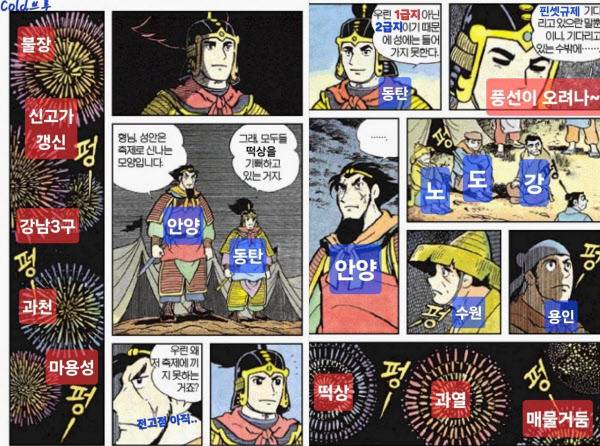 이를 바라보는 장수들에는 ‘동탄’, ‘안양’이라고 기재돼 있다. 안양이라 표시된 장수가 “우린 왜 저 축제에 끼지 못하는 거죠?”라고 묻는다. 이에 동탄으로 표시된 장수가 “우린 1급지가 아닌 2급지이기 때문”이라며 “핀셋규제를 기다리고 있으란 말뿐이니 기다리고 있을 수밖에”라고 답한다.