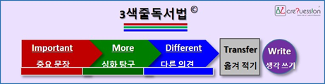 종이책이나 종이 문서를 읽으면서 3색펜으로 밑줄을 그으면서 읽고나서, 3색줄독서 노트에 색으로 구분하여 필사하는 방식이다. 이것은 저작권이 등록되어 있다.