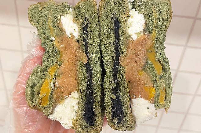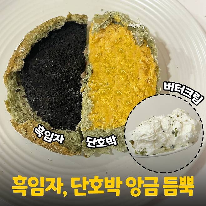빵 반개에 위아래로 발린 흑임자와 단호박 앙금! 밥심이 따로따로 먹어봤는데 흑임자와 단호박 존재가 확 나타나진 않았아요. 흑임자는 팥과 섞였는지 팥 맛이 더욱 강하게 느껴졌답니다.