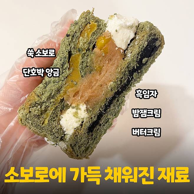 쑥 소보로에 단호박, 흑임자 앙금이 한 겹씩 채워져있고 버터크림과 밤잼크림까지~ 이번 고대빵은 색도 알록달록해서 더 먹음직스러웠답니다ㅎㅎ