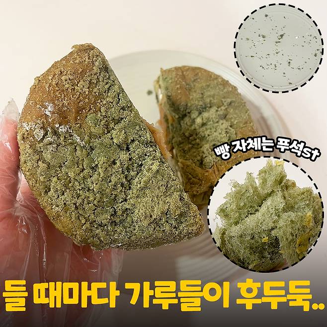 저온숙성한 빵에 국산 쑥 소보로를 잔뜩 토핑 했다고 하는데 소보로를 보니 아시겠죠.. 잔뜩 묻어있지만 들 때마다 후두둑 떨어지는 가루들 때문에 먹기가 너무 불편하더라구요ㅠㅠㅠ