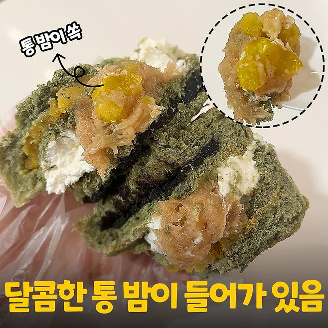그리고 보이지 않았던 통밤이 가운데에 들어있었어요. 많이 들어있진 않았지만 간간이 들어있는 통밤 덕분에 식감은 풍성했습니다~