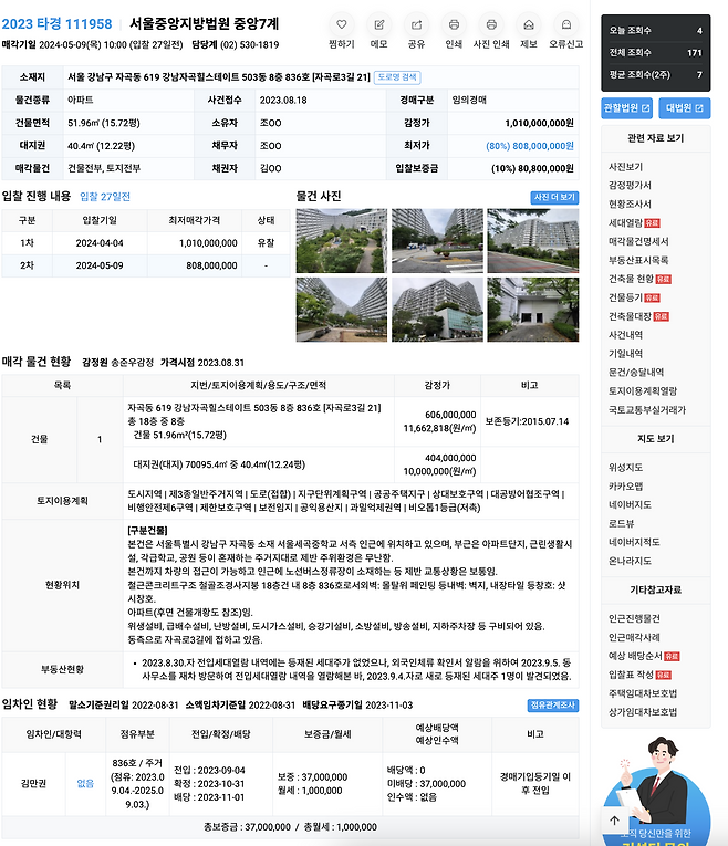 맨 위의 2023타격 111958은 물건 고유번호예요. 두부는 저걸 검색용으로도 이용해요. 네이버에서 해당 번호를 검색하면 각종 부동산 경매 전문가들이 분석한 글들이 나와요. 즉 이 물건은 위험하다 안 위험하다 등의 분석이요. 그럼 두부가 분석한 게 맞는지를 이중 체크할 수 있어요. 이건 팁이랍니다!