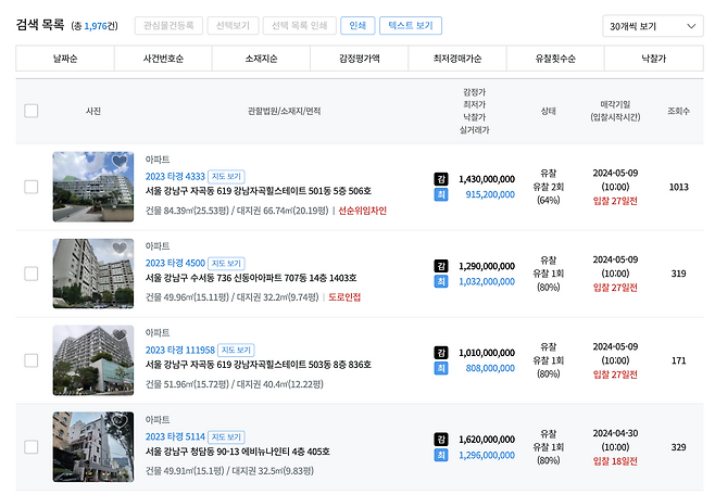 서울-강남구-아파트로 검색하니, 4/12일 기준 총 1976건의 경매물건이 쫙 나열돼요. 두부는 저기서 빨간색(선순위임차인 등) 글씨가 보이면 우선 패스합니다. 처음부터 복잡한 물건에 도전할 깡은 없거든요. 저런 거 패스패스해도 여전히 물건은 많습니다.