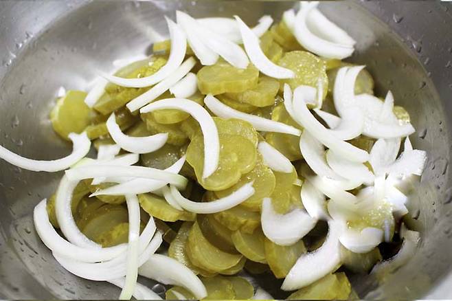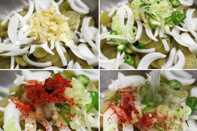 준비한 볼에 썰어놓은 오이지와 마늘, 청양고추, 양파, 파를 썰어넣고 물을 부어줍니다.