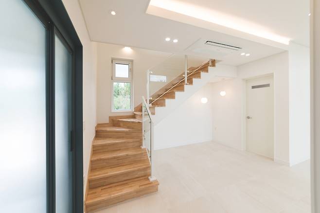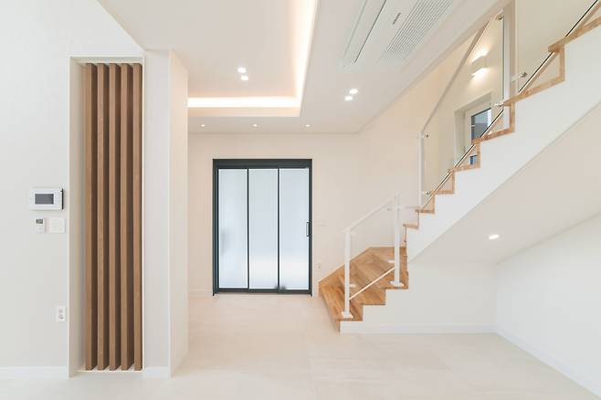 화이트 톤 벽지로 마감해 깨끗한 이미지를 연출했고 계단실과 거실로 향하는 복도의 벽면 한쪽에 브라운 톤 목재 루버로 포인트 주어 공간에 재미를 더했다.