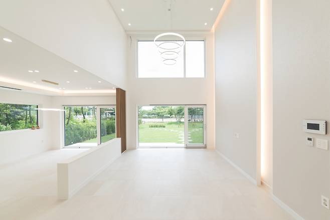 벽면은 화이트 톤 벽지로 통일해 밝은 분위기를 연출했다. 오픈 천장으로 계획하고 높은 아트월을 구성해 웅장한 느낌이 들도록 했다. 거실에서 보이는 2층에는 유리난간을 설치해 공간이 더욱 넓어 보이도록 계획했다. 천장에 달린 독특한 원형의 샹들리에는 거실 완성의 핵심 포인트다.