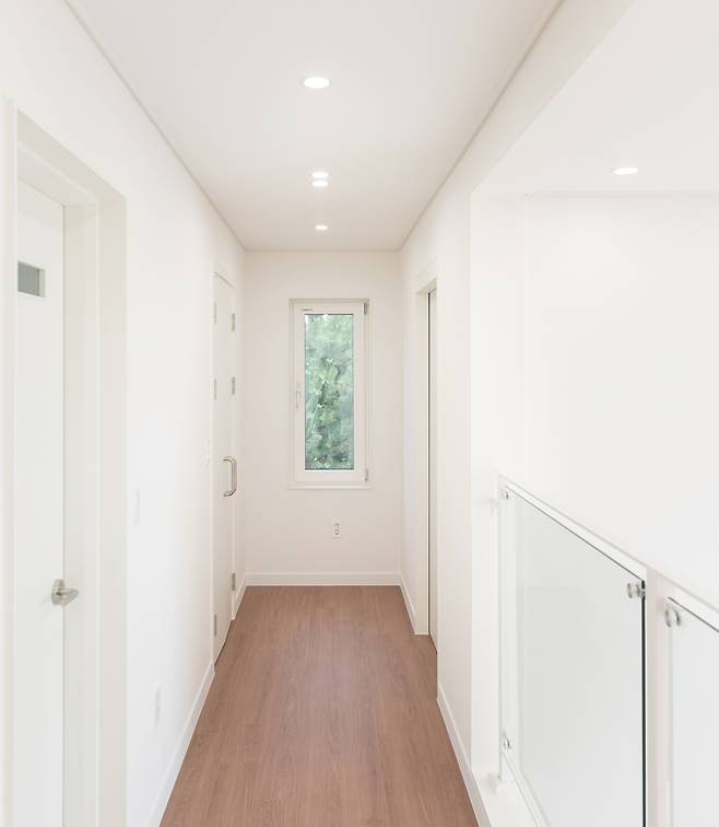 화이트 톤 벽지마감과 브라운 톤 바닥마감이 조화를 이룬다. 복도 한쪽 끝 세로로 길게 난 창을 통해 외부 풍경을 조망할 수 있다.
