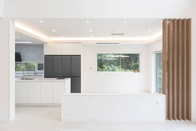 대비를 이루는 화이트 톤 벽지마감과 블랙 톤 가구로 포인트 있는 주방 분위기를 연출했다. 식당은 거실 사이에 나지막한 가벽을 세워 두 공간을 분리하면서도 넓은 공간감을 확보했다. 또한 마당과 바로 연계돼 자연을 즐기며 맛있는 식사를 할 수 있는 확장감 높은 공간이다.