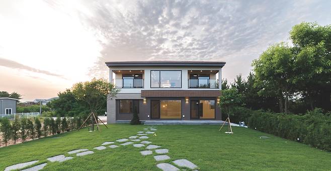 남향인 본 주택은 건물을 최대한 북쪽에 배치함으로써 남쪽에 넓은 마당과 전망을 확보했다. 마당과 맞닿은 주방·식당에는 거실과 연계돼 더욱 넓은 공간감은 물론 자연의 정취까지 느낄 수 있다. 2층 포치에는 남향의 탁 트인 전망을 즐길 수 있도록 유리 난간을 설치했고 브라운 계열로 색상 포인트를 준 외벽은 따듯함과 안정감을 더한다.
