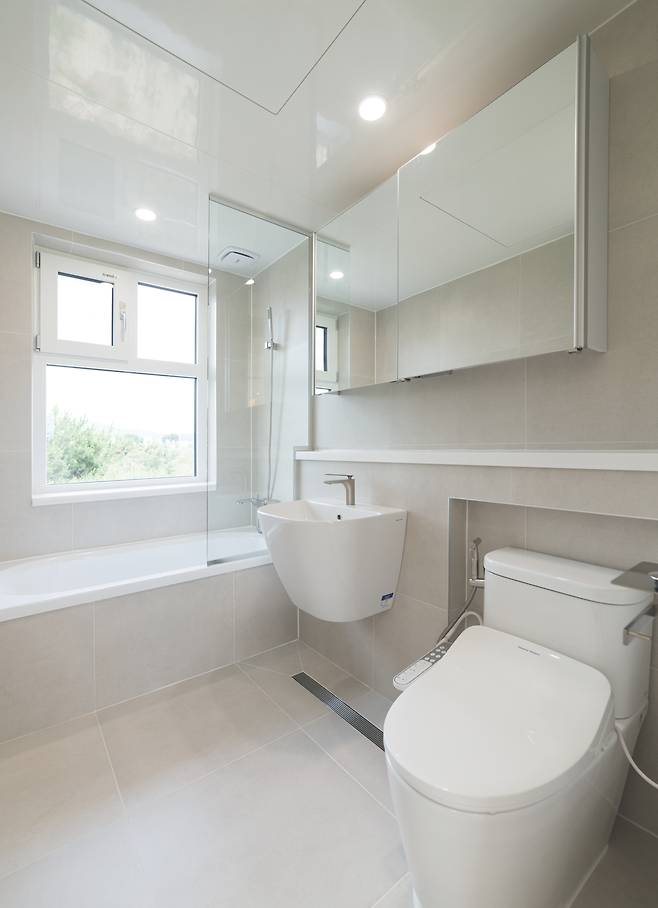 베이지 톤 타일을 사용해 부드러우면서 깨끗한 분위기를 연출한다. LED 거울을 사용해 욕실에 포인트를 줬다. 샤워 공간에는 유리 가림막을 설치해 보다 넓어 보이는 효과를 가져왔다.