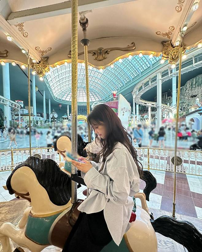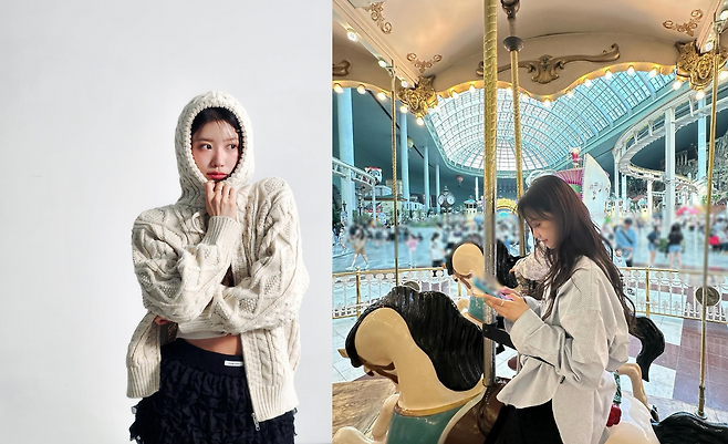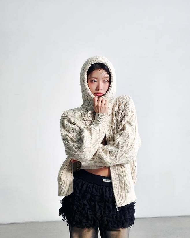 그레이 컬러의 케이블 니트 카디건에 화이트 터틀넥을 매치해 세련된 겨울 패션을 선보였다. 하트 모양 단추 디테일이 돋보이는 카디건은 클래식한 무드를 자아내며, 긴 생머리와 자연스러운 메이크업으로 여성스러운 분위기를 완성했다.