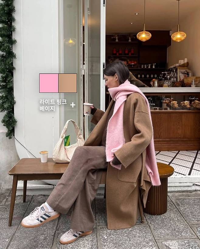 베이지 롱코트에 라이트 핑크 머플러를 더하면 우아하면서도 여성스러운 분위기를 연출할 수 있어요.