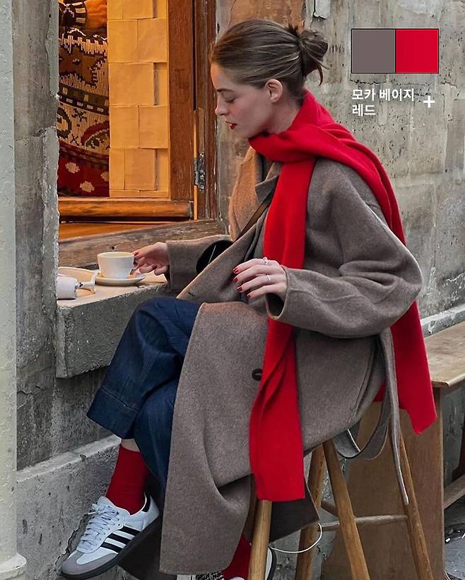 클래식한 모카 베이지에 강렬한 레드로 포인트를 주는 조합이죠.